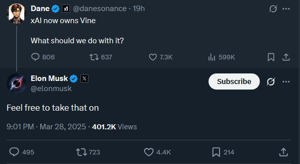 The idea of a Vine revival isn’t just fan speculation anymore—Elon Musk has added fuel to the fire. On March 28, 2025, a user posted, “xAI now owns Vine. What should we do with it?” Musk replied directly: “Feel free to take that on.” The tweet has already racked up over 400,000 views, signaling interest in reviving the defunct six-second video app.